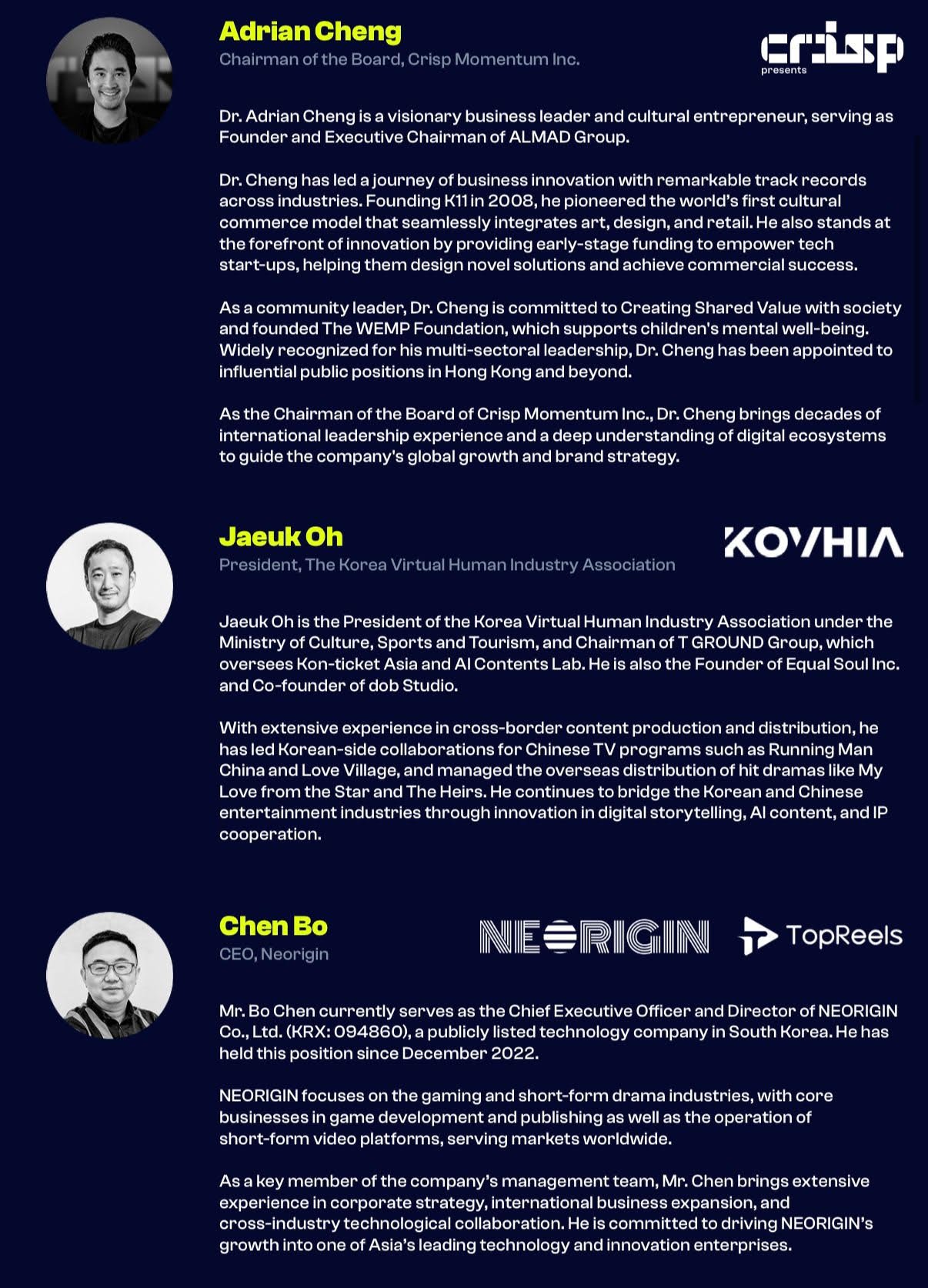 十一月;鄭志剛於首爾主持「Crisp全球短劇大會」,以「劇力未來、世界同屏」為主題,宣布公司將重點投資手機端韓國短劇、AI動漫劇等內容。並聯合全球ACGN領域IP方展開深度合作。